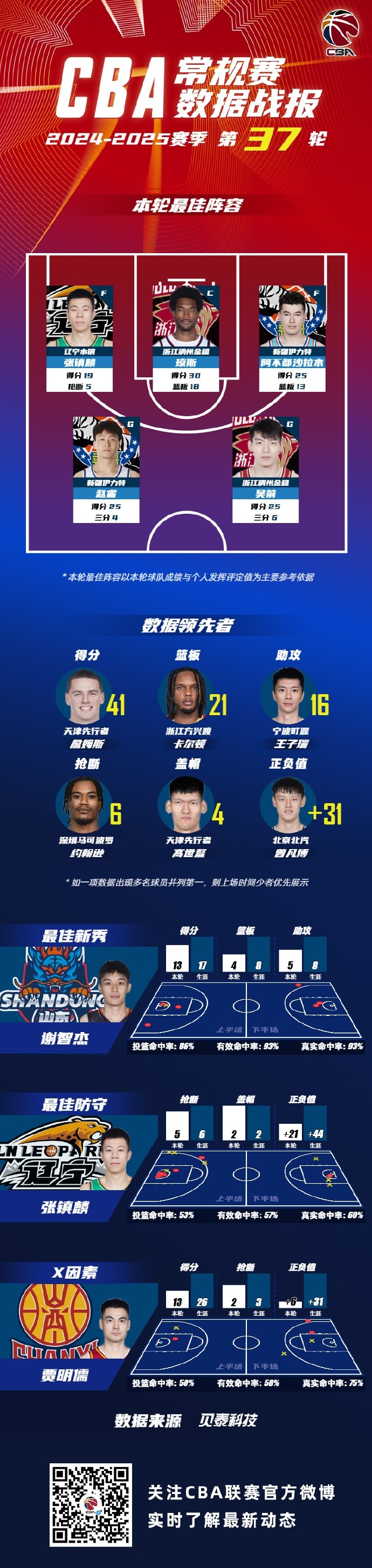 体育直播3月9日讯 CBA官方公布了本赛季常规赛第37轮最佳阵容,张镇麟、吴前、琼斯、赵睿、阿不都沙拉木入选。 官方原文如下: 2024-2025赛季CBA联赛常规赛第37轮结束较量,来自辽宁沈阳三生飞豹篮球俱乐部的张镇麟 ,浙江稠州篮球俱乐的琼斯和吴前 ,新疆广汇篮球俱乐部的阿不都沙拉木和赵睿入选CBA联赛常规赛第37轮最佳阵容! 数据领先者方面:天津荣钢篮球俱乐部球员詹姆斯以单场41分的数据领衔得分榜; 浙江广厦篮球俱乐部球员卡尔顿以单场21篮板的数据领衔篮板榜; 宁波富邦男篮俱乐部球员王子瑞以单场16助攻领跑助攻榜; 深圳新世纪烈豹篮球俱乐部球员约翰逊以单场6抢断的数据领衔抢断榜; 天津先行者球员高世鳌以单场4封盖的数据领跑盖帽榜; 北京首钢篮球俱乐部球员曾凡博以+31的正负值领先。 第37轮最佳新秀由来自山东高速篮球俱乐部的谢智杰获得; 第37轮最佳防守球员由来自辽宁本钢的张镇麟获得; 第37轮X因素球员由来自山西汾酒职业篮球俱乐部的贾明儒获得。