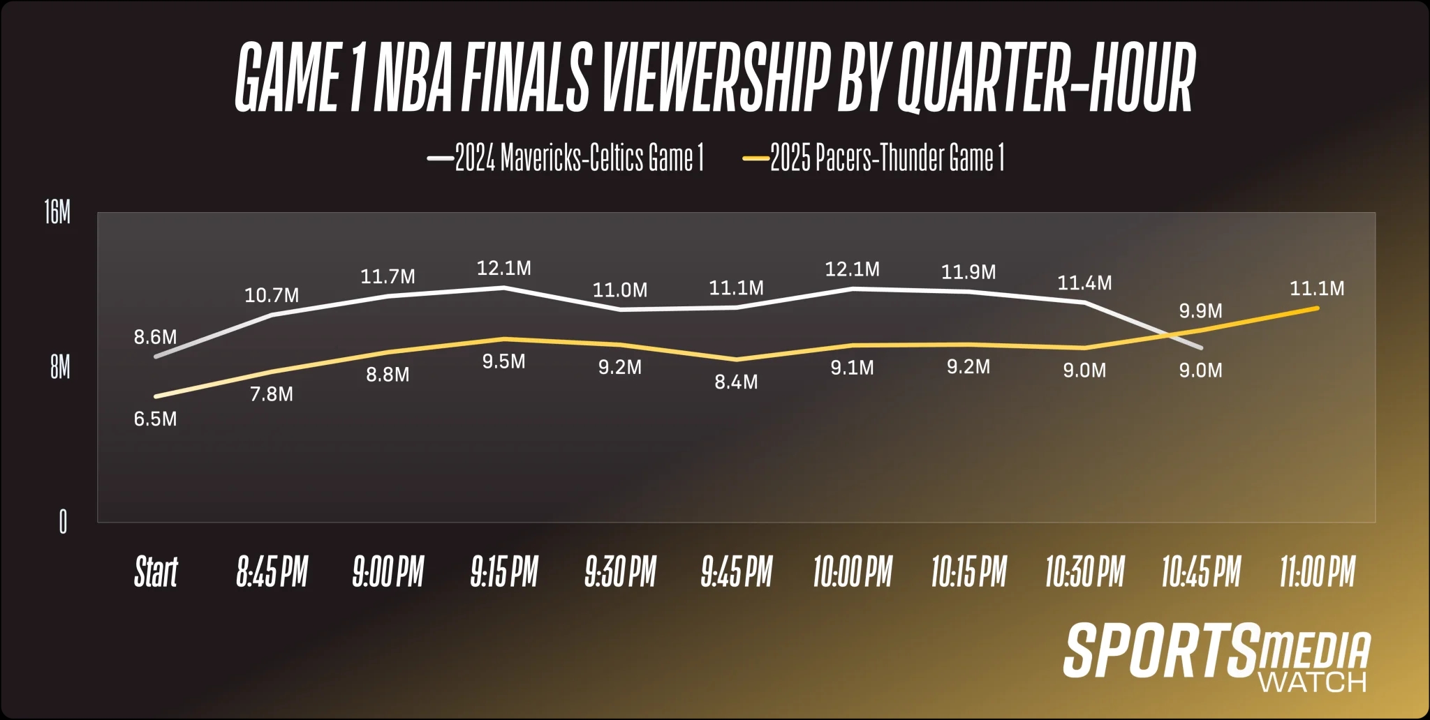 体育直播06月07日讯 NBA总决赛步行者VS雷霆G1,步行者(1)111-110击败雷霆(0)。 据新闻媒体平台Sports Media Watch统计报道,NBA总决赛G1虽然打出了联盟所期望的精彩结局,但这仍不足以阻止步行者对阵雷霆的系列赛开局收视率创下非新冠时期的新低。 NBA总决赛G1在 ABC 电视台的平均收视率为 4.7,观众人数为 891 万。是自尼尔森观众统计数据时代(1988 年至今)收视率最低、观看人数最少的总决赛首场比赛。 注:受新冠疫情影响的系列赛,即 2021 年 7 月雄鹿与太阳的G1(4.5,870 万)和 2020 年 9 月在“泡泡园区”中的热火与湖人的G1(4.1,769 万)。 哈利伯顿的绝杀帮助比赛收视率在最后几分钟的观众峰值达到1107万,这场比赛是自2021年那场总决赛揭幕战以来,观众人数最少的总决赛比赛(任何场次),也是尼尔森收视统计时代观众人数第九少的总决赛比赛。 与去年独行侠对阵凯尔特人的总决赛G1相比(5.7%,1099万):今年的收视率下降了18%,观众人数下降了19%。若非步行者末节逆转,跌幅可能会更大。美国东部时间晚上10点45分开始的15分钟时段之前,观众人数比去年同期下降了23%(从1120万降至860万),但之比赛最后几分钟,观众人数相比去年凯尔特人大胜的最后几分钟(900万)反而增长了15%,达到1040万。 总决赛的对阵双方来自电视市场排名第25(印第安纳)和第47位的城市(俄克拉荷马)。 近两年总决赛G1比赛收视率——白色2024年、黄色2025年