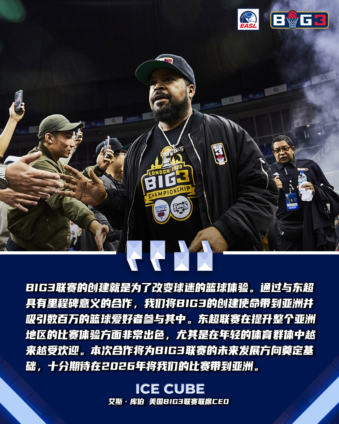 洛杉矶/中国香港特别行政区,2025年6月16日 — 作为全球顶级3x3篮球联赛的美国BIG3联赛(简称:BIG3)和亚洲顶级篮球联赛——东亚超级联赛(EASL,简称:东超)共同宣布:双方正式建立全面和高级的战略合作伙伴关系,并在2026年为亚洲球迷带来全球最顶级的3x3篮球赛事。 对于双方而言,本次合作都是翻开全新篇章的标志性事件,将使BIG3及其享誉全球的3x3篮球赛事和娱乐精神与东超深度结合,全面拓展东超在亚洲区域的最顶级篮球联赛及参赛球队、球迷社群。 除了球场的激烈对抗,本次合作更是包含了丰富多彩的文化交流——除了全新定义比赛节奏、防守强度和创造力,BIG3还独拥其他联赛并不具备的娱乐精神,必将为亚洲各地球迷和球员提供全新的篮球体验。 BIG3赛事以速度、身体和不间断对抗而闻名,在美国拥有强大的球迷群体,正面向全球扩张其影响力。在汇聚了大量现役和退役NBA球员、名人堂教练及国际3x3篮球巡回赛顶级人才的基础上,BIG3自主培育了代表全球最高水平的3x3篮球赛事,通过与东超合作,不仅能为亚洲地区展示全新的篮球体验,并将切实提高该地区的3x3篮球水平。 “BIG3的创建就是为了改变球迷的篮球体验,”BIG3联合首席执行官艾斯·库伯(Ice Cube)表示,“通过与东超具有里程碑意义的合作关系,我们将BIG3的使命带到亚洲并吸引数百万的篮球爱好者参与其中。东超在提升整个亚洲地区的比赛体验方面非常出色,尤其是,在年轻的体育群体越来越受欢迎。本次合作将为BIG3的未来发展方向奠定基础,十分期待在2026年将我们的比赛带到亚洲。” 2025年6月14日,BIG3在美国芝加哥开启了第8个赛季的揭幕战。BIG3作为体育领域非常成功的联赛,自2017年首次亮相便声名鹊起,并迅速培养了令人难以置信的多样化、参与度和活跃度都非常高的球迷群体,其体量在美国名列前茅,足够媲美NWSL(美国女子足球职业联赛)、NHL(美国国家冰球联盟)、MLS(美国职业足球大联盟)和MLB(美国职业棒球大联盟)等北美顶级职业体育联赛。 此前,BIG3已多次将其品牌带到美国海外,在巴哈马拿骚、加拿大多伦多和英国伦敦等地举办国际比赛,与世界各地球迷零距离接触——其中,2023年的BIG3更是在O2体育馆(伦敦北格林威治体育馆)为赛季总冠军加冕,门票售罄,蔚为壮观。2025年又与澳大利亚NBL(国家篮球联盟)建立了合作关系,2025年秋季,首次将BIG3比赛带到澳大利亚。 东超自创建以来始终尽最大努力凝聚亚洲各顶级篮球联赛表现最好的球队,全面提高该地区的篮球水平。本次与BIG3的合作,是东超新发展方向的标志——引入全新的篮球风格,并通过篮球为亚洲和世界建立更多的联系。 “我们是在挑战极限,”东超首席执行官李小龙(Henry Kerins)表示,“BIG3给篮球带来了不同水平、不同风格和不同能量。与东超同行,一起将赛事带到亚洲将彰显其超强竞争力,球迷亦将看到新鲜而真实的事物。而这,只是开始。” 在2026年到来前,东超和BIG3会继续在活动策划、球迷参与和媒体推广方面进行合作,并发布更多关于办赛城市及赛程的消息。